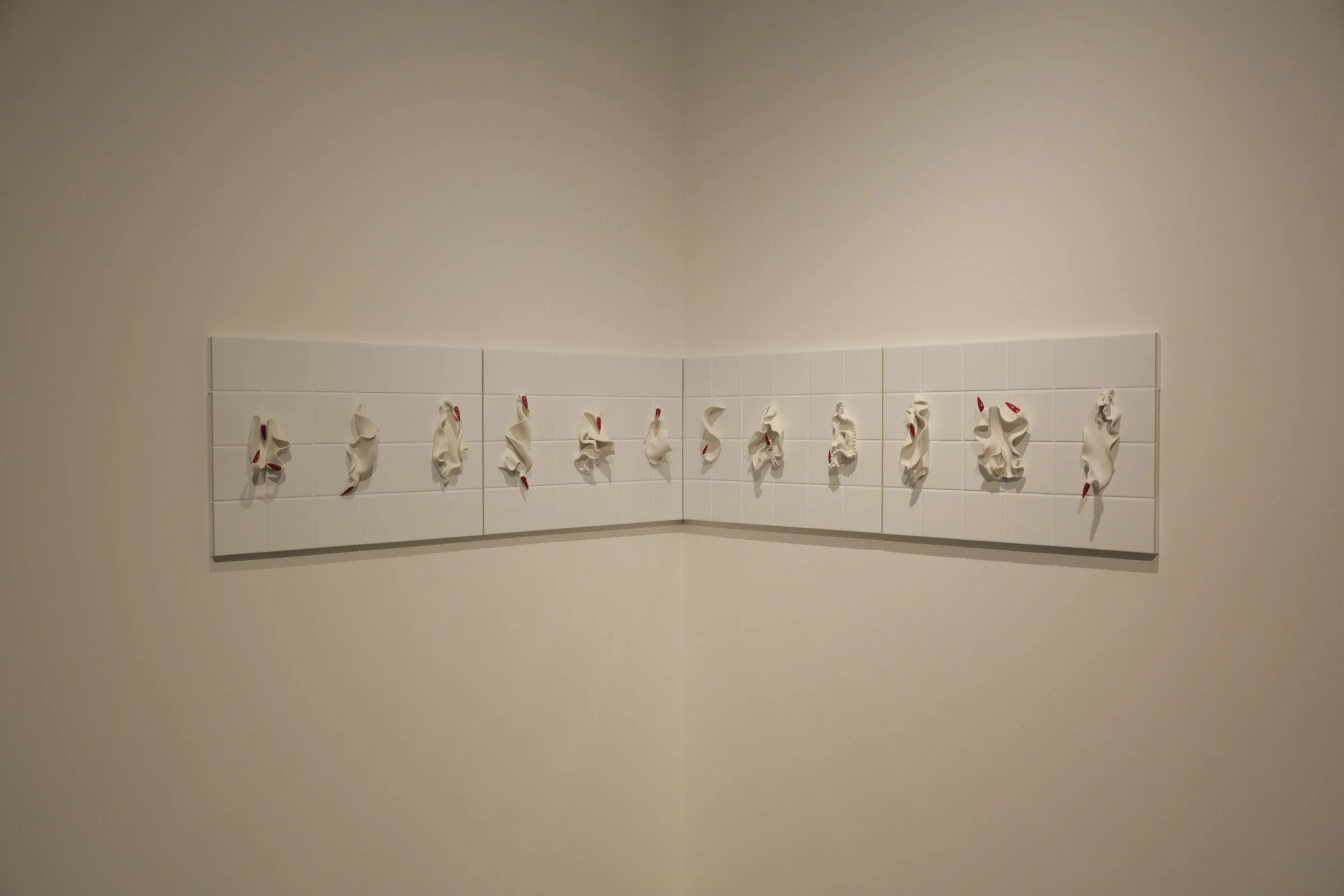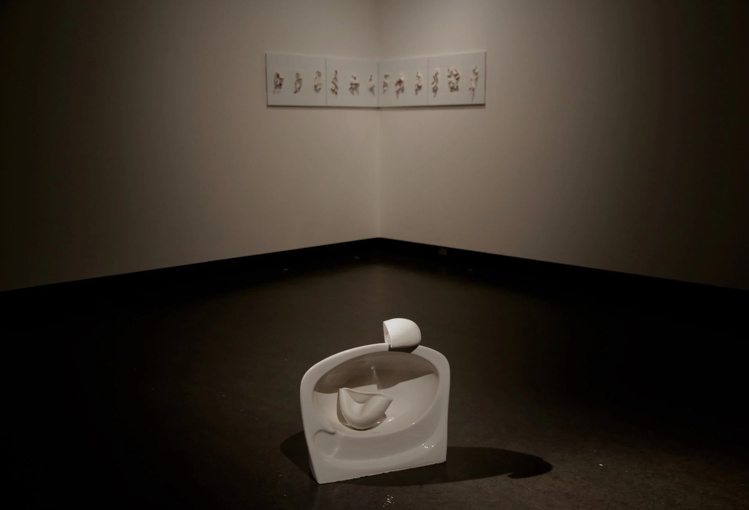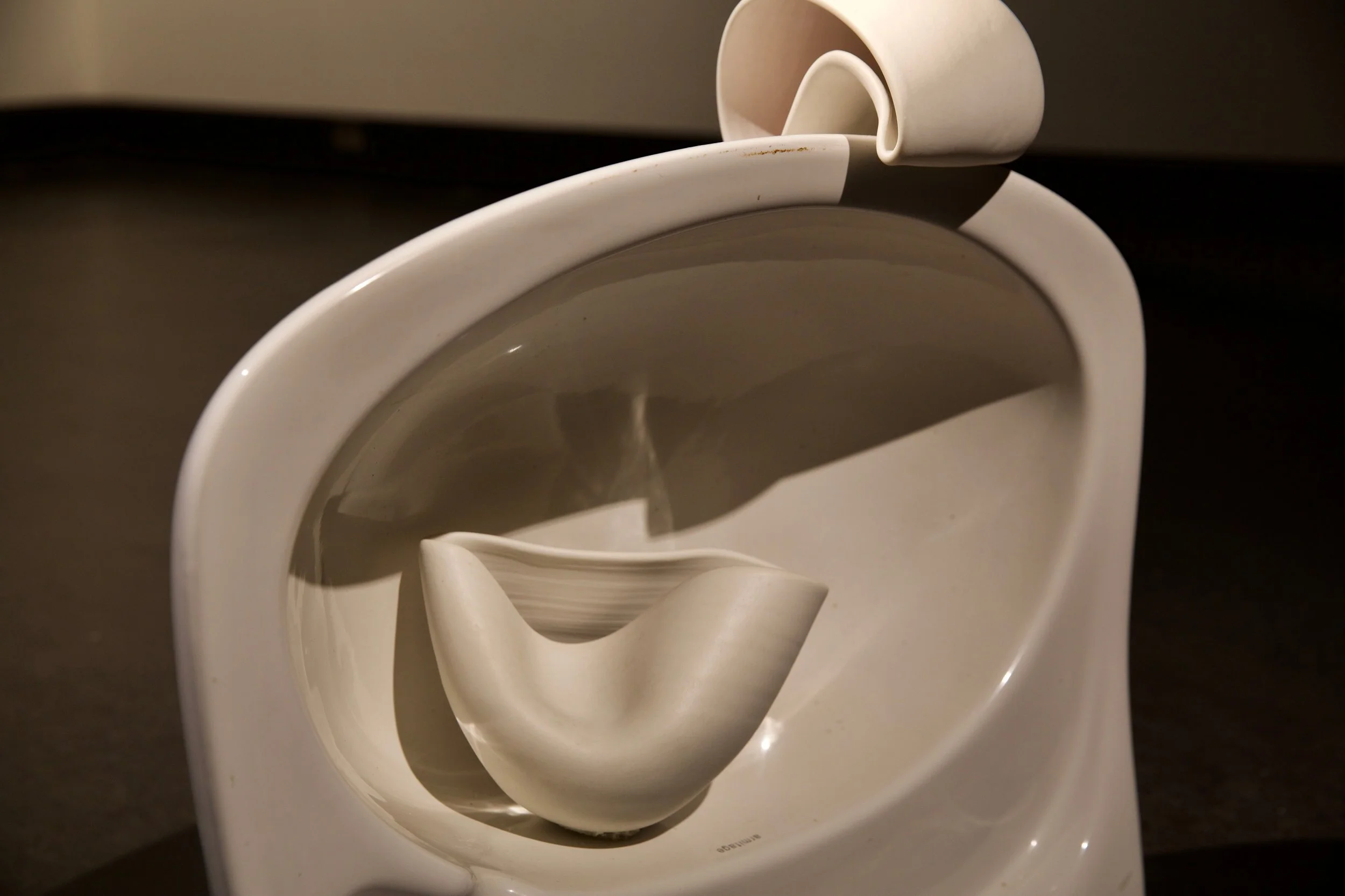 Titled Beauty in Bodily Realities: Recontextualising the feminine experience through expanded ceramic practice; this practice-led research uses hand crafted porcelain forms, readymade materials and ephemeral substances in unconventional methods of display to create active, temporal installations.
