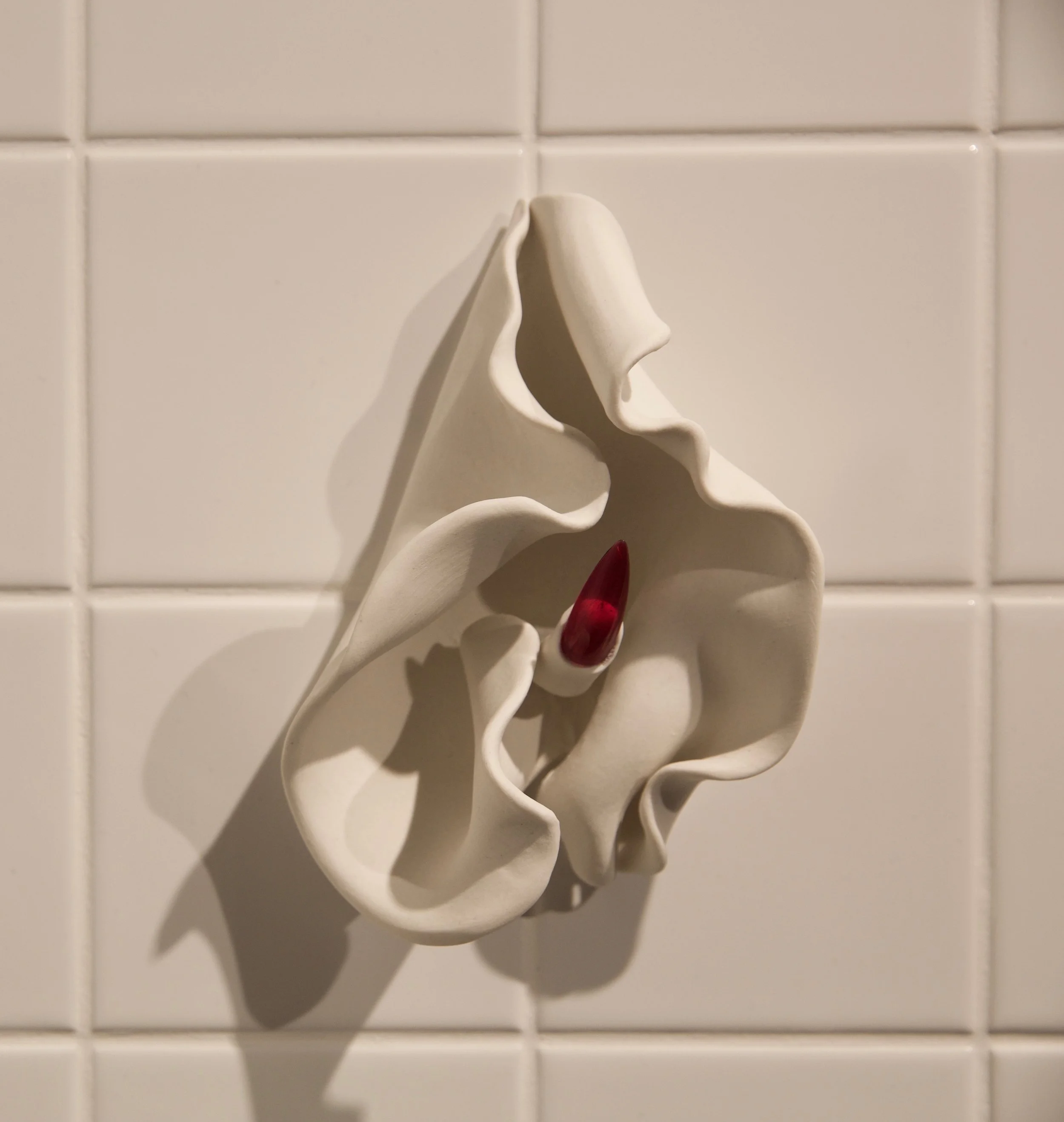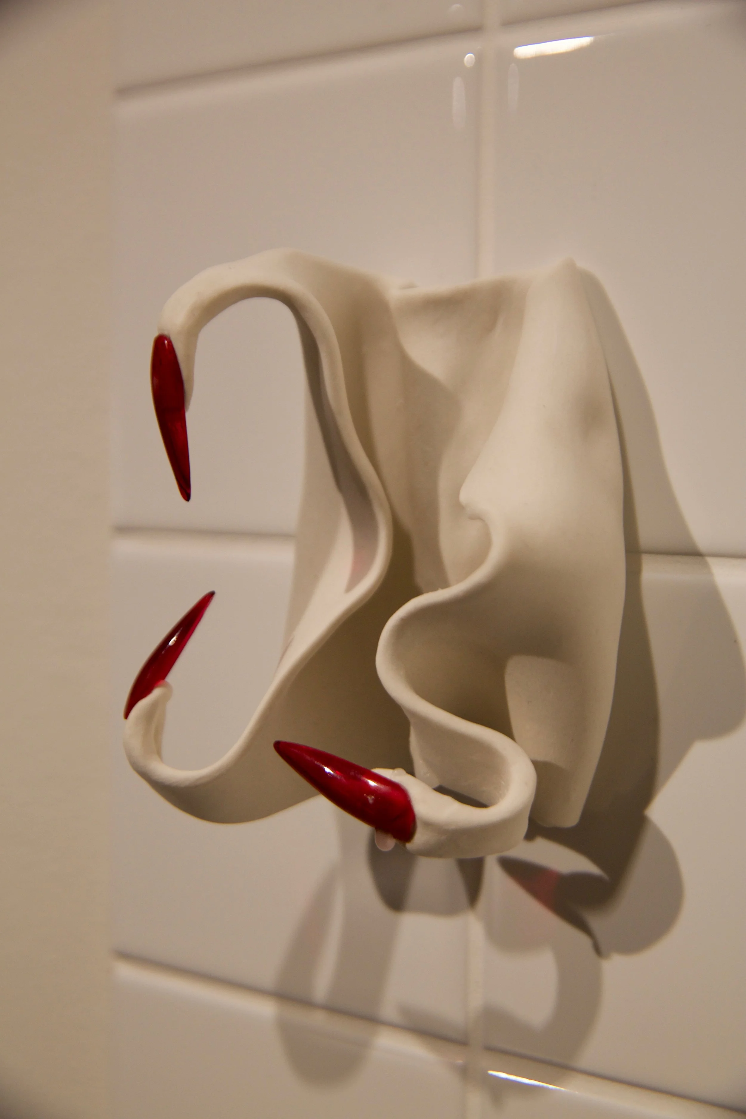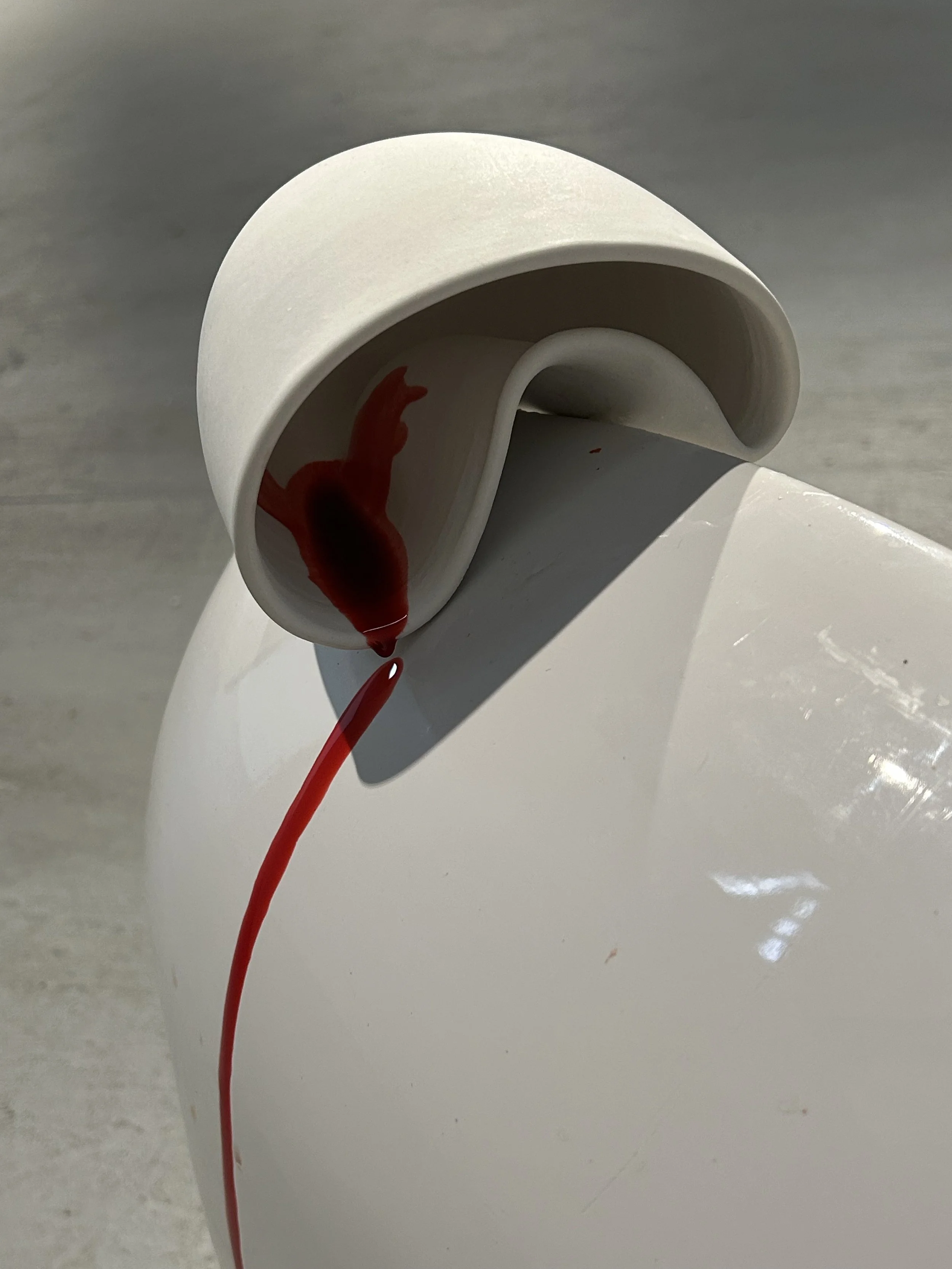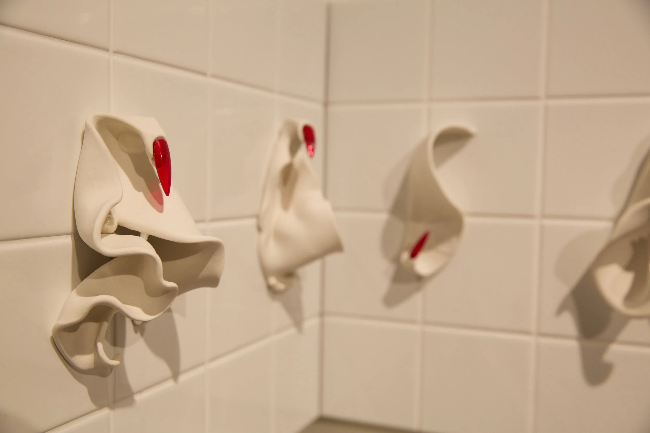 Intimate hand-made sculptures are combined with edible liquids made of white sugar icing and red raspberry syrup to signify bodily fluids. This method of surface treatment is used to evoke abject personal familiarity alongside more misunderstood aspects of femaleness.